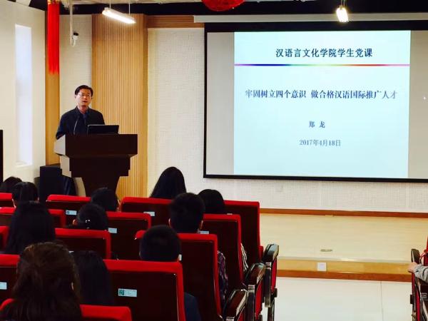 党委负责人郑龙以“牢固树立‘四个意识’,做合格汉语国际推广人才”为题开始首场讲座。讲座由学院党委副书记、副院长满荣主持,90足球比分app