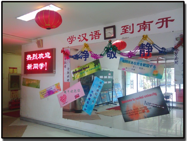 特地制作了写有各种语言的“南开欢迎你”,“祝你度过美好的一天”等欢迎横幅,同时还挂上了中国节庆期间常用的红色灯笼,留学生一进门就能够感受到浓厚的文化气息。