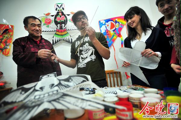 图为留学生们在民间艺人的指导下,制作小风筝。渤海早报记者 游思行 通讯员 马超 摄