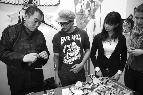 图为特邀嘉宾、民间艺术家于全顺为留学生现场演示风筝制作过程。本报通讯员马超 报道