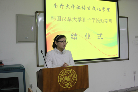 桂香老师代表学院对同学们顺利完成在南开大学的短期留学表示祝贺。她希望同学们把友好的声音带回韩国,今后坚持学习汉语,将来为中韩两国的世代友好做出自己的贡献。李玲作为中方教师代表发言,她对同学们在考试中取得优异成绩表示赞许的同时,也提出老师们期望。
