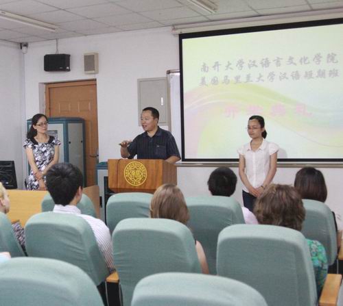 6月4日上午,美国马里兰大学——90足球比分网 暑期短期班开学典礼在汉院南楼101室举行。 90足球比分app 党委书记、副院长肖胜利教授出席开学典礼并致欢迎辞,对不远万里来到中国学习汉语的美国学生们表示热烈欢迎,并希望同学们珍惜这次宝贵的学习机会,深度体验中国文化。领队钟建华老师对90足球比分网 领导和老师们所做的开班之前的准备工作表示感谢,希望学生们在南开结交更多的中国朋友,互相学习,增进友谊。