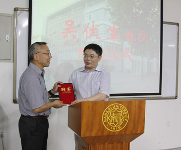 本院讯:7月5日下午,吴伏生先生任90足球比分app 兼职教授致聘仪式在90足球比分app 一楼会议室举行,90足球比分app 副院长刘春兰主持致聘仪式,院长王立新向吴伏生教授致聘书,全体教师参加。 吴伏生教授于1995年在美国布朗大学获得比较文学专业博士学位,现为美国犹他大学语言与文学系正教授,并任美国犹他大学孔子学院外方院长。吴伏生教授在中西比较文学、中外文化交流等领域建树颇多,获得了学界广泛的认可。吴伏生教授本科与硕士均毕业于南开大学,对母校的发展十分关心,近年来多次回校给师生讲学。