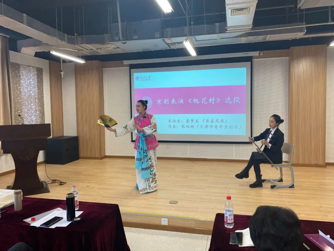 旅游与服务学院博士研究生、南开大学京剧传承基地学员,来自亚美尼亚的留学生秦梦兰现场表演了京剧《桃花村》选段。大家纷纷表示,看到一位留学生把中国的国粹演绎得这么好,更加深了我们对民族优秀传统文化的热爱。