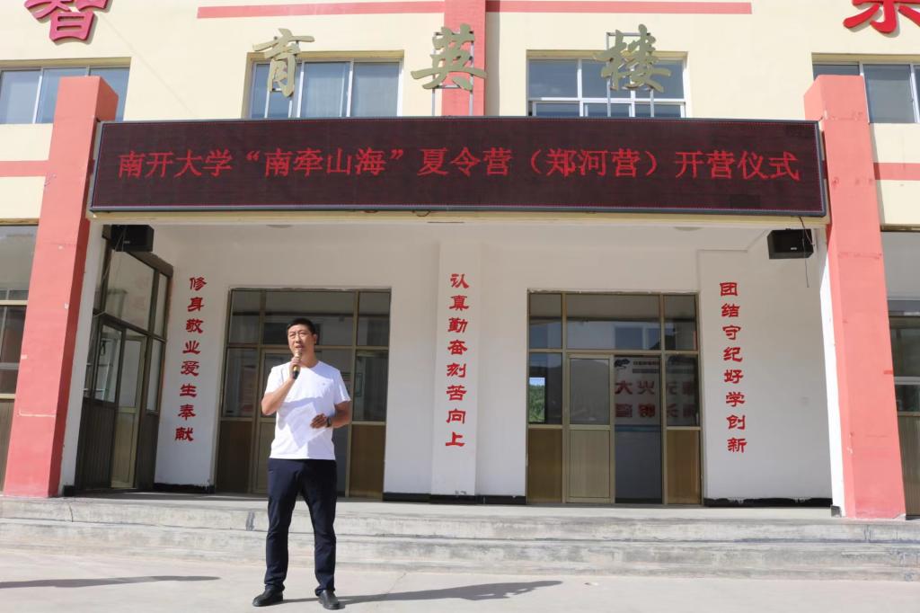 开营仪式上,欧迎希首先就“南牵山海”夏令营的建营背景和课程设计等内容进行介绍。他提到,这是南开大学中外学生实践队与郑河小学的第二次合作,此次以暑期夏令营的形式为学生带来“趣味科普”和“多元文化”两个模块的内容。充分利用实践队员文化背景多元、专业多样的优势,通过设计丰富有趣的课程和活动,帮助小学生开阔视野,增进对医学、法律等知识的了解。