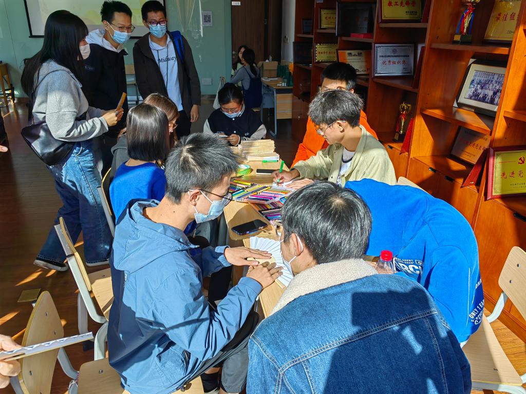 “诗情画意”“起舞弄清影”“漫步南开”和“天涯共此时”环节则将目光聚焦在同学们对中国和南开的热爱,借着国庆和校庆的氛围,通过各项活动为同学们搭建一个了解南开、表白南开、讲述南开的舞台。“诗情画意”游戏要求中外学生互相搭档,你画我猜,一起完成“南开大学”“张灯结彩”等词的表演任务,形象的肢体语言和夸张的抽象画作给现场带来欢声笑语,默契十足的同学们如有神助,顺利地完成了考验。在“起舞弄清影”环节里,同学们或表演才艺,或分享自己与南开的故事,有的倾情朗诵《水调歌头·明月几时有》,有的饱含深情地演唱《我的中国心》《一起向未来》,留学生同学还兴致昂扬地分享了自己在南开学习汉语的有趣经历。“漫步南开”环节中,同学们在工作人员的指引下,漫步校园,与南开经典建筑合影打卡。在漫步中,同学们也了解到不少熟悉的建筑背后的故事:思源堂曾在日军的轰炸下得以保存,大通学生中心形似一朵盛开的海棠花……同学们重新体悟到平日里司空见惯的南开校园之美,更增进了对南开历史的了解。“天涯共此时”环节中,同学们在明信片上写下自己的节日寄语,对未来的期许以及对祖国的祝福,随后进行交换,薄薄的卡片承载着同学们美好的心愿,交换之间,祝福也被分享与传递。