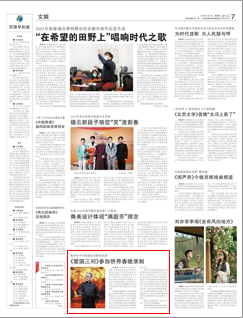 本报讯(记者 王洋)记者昨日获悉,由市委统战部、市归国华侨联合会、南开大学天津校友会、天津海河传媒中心等单位共同主办的“亲情中华·奋进的春天——2023天津市侨界新春电视晚会”日前在天津海河传媒中心录制完成,南开大学京剧传承基地创作的校史剧《爱国三问》受邀参加了晚会录制。