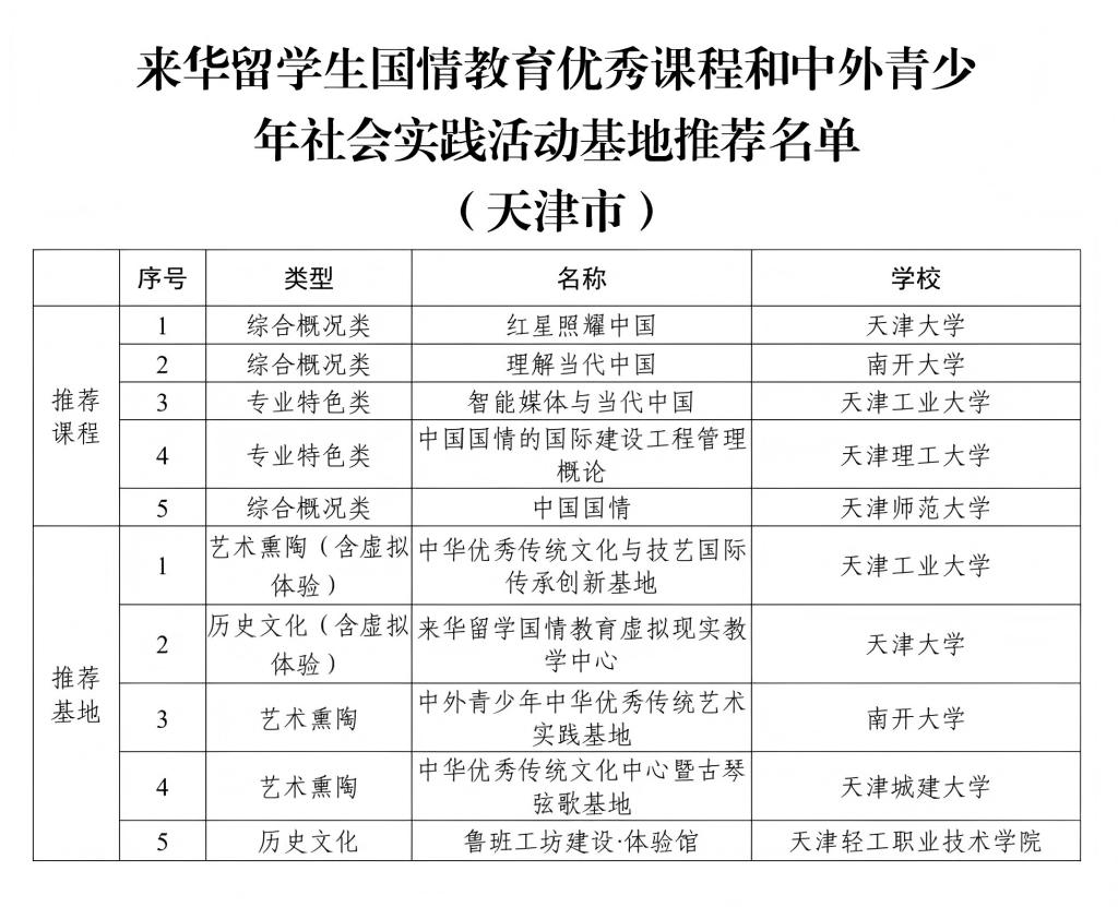 (通讯员 王红厂)近日,受教育部国际合作与交流司委托,中国教育国际交流协会面向全国高校开展了首批来华留学生国情教育优秀课程和中外青少年社会实践活动基地征集工作。经专家研究和审定,最终共推荐了111门课程和 115个基地。其中,天津市5门课程和5个基地获推,南开大学的“理解当代中国”课程和“中外青少年中华优秀传统艺术实践基地”位列其中。