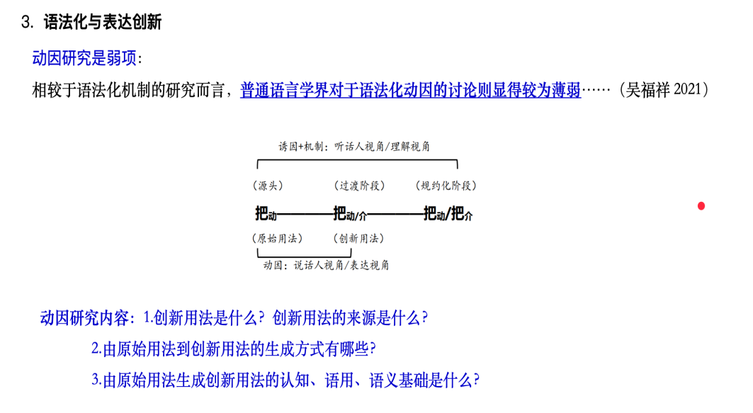 通过对历时语料的剖析,王世凯教授作出论证:“表达创新”是驱动语法化进程的重要动因之一,即语言使用者出于强调、追求生动、表达新奇或使信息更清晰等交际目的,主动地创新表达方式,从而引发语法结构的固化与演变。他以“再”的语法化对“表达创新”进行验证,指出语法化的动因实质为“用变”。