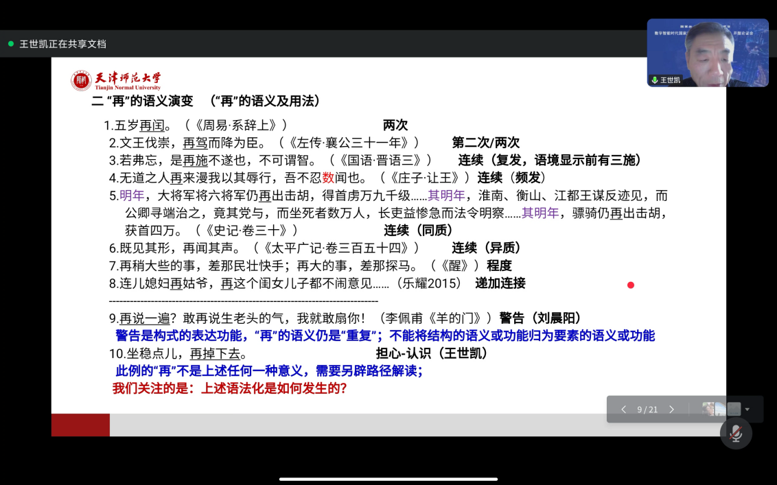 王世凯教授从“再”的语义及其演变谈起,以跨越古今的丰富语料为依托,系统呈现了其语法化轨迹,并提出问题进而切入研究——“再”的这种语法化是如何发生的?