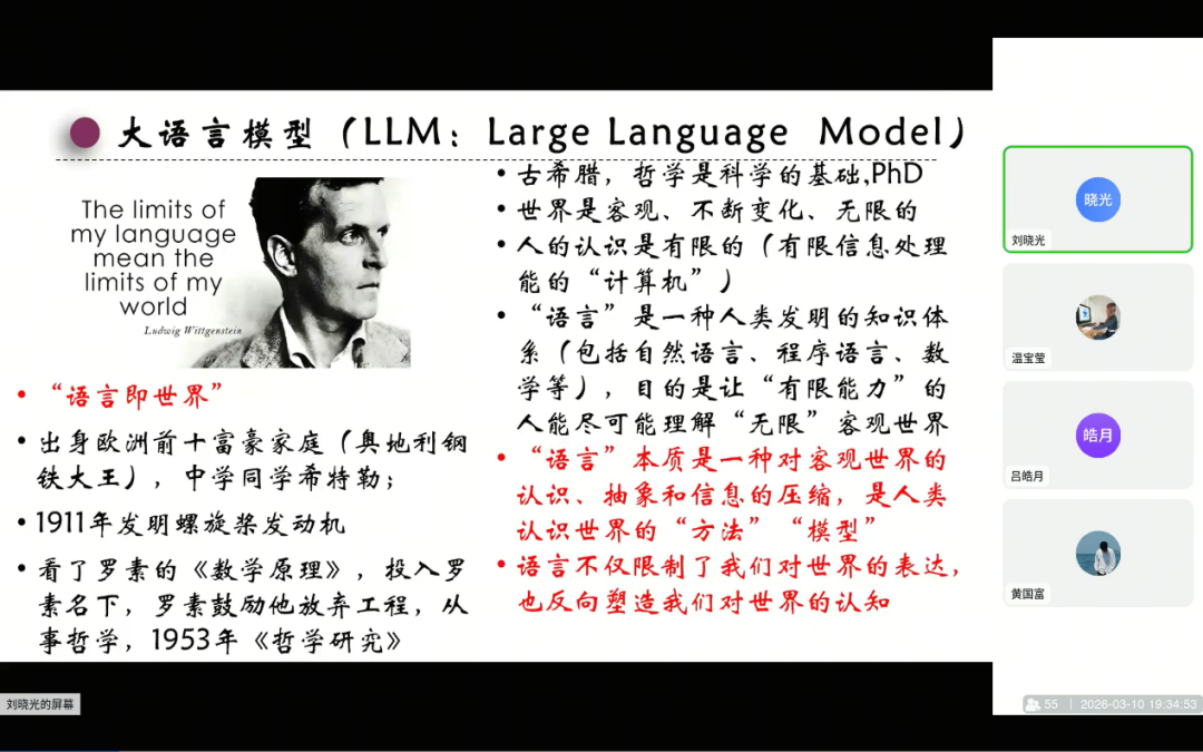 讲座中,刘晓光教授首先以科普的视角,从AI大模型的底层逻辑出发,为老师与同学们搭建起人工智能与语言学的沟通桥梁。他以维特根斯坦“语言即世界”的观点为切入点,指出人类的知识体系本质是语言,而AI通过学习人类语言间接认识世界,这也是大语言模型与语言学深度关联的核心原因。在回顾人工智能发展历程时,刘晓光教授梳理了从图灵机、图灵测试的提出,到达特茅斯会议确立“人工智能”概念,再到机器学习、深度学习发展的全脉络,解析了人工智能三次发展高峰与两次低谷的背后原因,重点介绍了2024年诺贝尔物理学奖得主在深度学习领域的贡献。