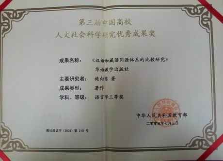 主要著述: 1. 《汉语和藏语同源体系的比较研究》 华语教学出版社,2000年;2003年该著作获得第三届中国高校人文社科优秀成果奖; 2.《诗词格律初阶》 天津大学出版社,2001年; 3.《音史寻幽》 南开大学出版社,2009年; 4.《古代汉语基础》 北京大学出版社,2010年。 主要论文: 1.《玄奘译著中的梵汉对音与唐初中原方音》,《语言研究》,1983年1期;2004年获天津市首届哲学社会科学优秀成果二等奖;1987年该文获得首届王力语言学奖; 2.《史记》中的韵语,《音韵学研究》,第一辑,中华书局1984年;1986年,获天津市第二届哲学社会科学优秀成果三等奖; 3.拼音造字法不自西夏文始,《民族语文》1985年5期; 4.上古介音*-r-与来纽,音韵学研究,第三辑,中华书局, 1994年; 5.有关汉语藏语比较研究的几个问题,《薪火编》,山西高校联合出版社1996年; 6.Pokazne zamenice za srednje rastojanie u klasi?nom kineskom jeziku, Orijentalistika 70 (贝尔格莱德大学语言学院东方语言系七十周年论文集), 1997年1月Pokazne zamenice za srednje ra,Orijentalistika 70: zbornik rad; 7.上古汉语声母*s-与*x-的交替,语言研究增刊,1998年; 8.也谈上古汉语的音节类型和构词类型,语言研究增刊,1998年; 9.同源字典衍义,《李新魁先生纪念文集》,中华书局,1998年9月; 10.文化误解和文化误导举例,《天津市对外汉语教学论文集(1996)》,天津人民出版社,1998年; 11.汉藏语前缀对上古汉语的影响,《道德与文明》增刊,1998年; 12.试论上古音幽宵两部与侵谈缉盍四部的通转,天津大学学报(社科版)1999年1期; 13.汉语音韵学与对外汉语语音教学,《天津市对外汉语教学论文集(1998)》,天津人民出版社,1999年; 14.鸠摩罗什译音研究,《芝兰集》,人民教育出版社,1999年12月; 15.汉语水平大纲汉字与日本当用汉字比较,《汉语言文化研究》(第七辑),天津人民出版社,2000年; 16.古籍研读札记,声韵论丛(10)台湾学生书局,2001年; 17.十六国时代译经中的梵汉对音(声母部分),《中国音韵学研究会第十一届学术讨论会、汉语音韵学第六届国际学术研讨会论文集》,香港文化教育出版有限公司, 2000年; 18.玄奘行年考辩,《面向21世纪人文科学若干问题研究》,天津大学出版社, 2001年; 19.“因为”为什么不能读作 yīn nwèi, 《汉语言文化研究》(第八辑),天津人民出版社,2001年; 20.十六国时代译经中的梵汉对音(韵母部分),天津大学学报(社科版),2001年1期; 21.“文化”为什么不能读作wén n?uà, 《汉语与汉语教学探讨集》,天津古籍出版社,2002年; 22.中国人姓氏的文化蕴涵,道德与文明增刊,2001年; 23.汉藏比较与训诂学—《生民》训诂举偶,天津大学学报(社科版),2002-1期; 24.梵汉对音与古汉语的语流音变问题,南开语言学刊,2002年1期; 25.北朝译经反映的北方共同汉语音系,《音韵论丛》,齐鲁书社,2004年 26.原始汉藏语的音节结构和构词类型再议,天津大学学报(社科版),2004年1期; 27.汉语普通话的-n韵尾,《乐在其中-王士元先生七十寿庆文集》,南开大学出版社,2004年; 28.《诗经》象声词的音韵分析,南开语言学刊第四辑,南开大学出版社,2004年; 29.联绵词的音韵学透视,《音史新论》,学苑出版社(北京),2005年5月; 30.汉藏语唇辅音与半元音w的交替,语言研究第26卷第2期,2006年6月; 31.《戈壁草》序,作家出版社,2007年; 32.汉藏比较研究中的历史层次和借词,语言科学6卷6期 总第31期,2007年; 33.关于汉语拼音字母a和g的印刷和书写规,(施向东、张婷婷),《第八届国际汉语教学讨论会论文选》,高等教育出版社,2007年; 34.转变教育理念,深化本科教学改革,《南开大学本科教改与创新论文集》,南开大学出版社,2007年; 35.等韵学和音位学, 中国音韵学(2006),南京大学出版社,2008年; 36.韵律与格律,《文学和语言的界面研究》,南开大学出版,2008年; 37.从系统和结构的观点看汉语上古音研究,南开语言学刊,2009年1期; 38.关于汉语普通话声母r的问题(施向东、陈希),《纪念林尹诞辰100周年学术讨论会论文集》,台北文史哲出版社,2009年12月; 39.对外汉语语音教学总体思路和大纲研究(施向东、丰琨),《第九届国际汉语教学讨论会论文选》,高等教育出版社,2010年; 40.等韵学与音系学,中国音韵学(2008),江西人民出版社,2010年; 41.悉昙学与等韵学关系再探,《汉文佛典语言学》,台北,法鼓文化出版,2011年; 42.梵漢對音與“借詞音系學”的一些問題,《佛經音義研究》,鳳凰出版社,2011年; 43.从佛典译音看轻唇音与舌上音问题,花木兰文化出版社(台湾),2012年; 44.梵汉对音和两晋南北朝语音,《语言研究》32卷3期,2012年7月。 人生格言:俯仰两间无愧怍,鸡虫得失笑痴迷。博客://sxdyuanyi.blog.163.com/